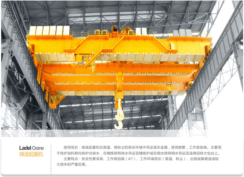 1、 鑄造起重機(jī)是煉鋼連鑄工藝中的主要設(shè)備。主要用于吊運(yùn)和轉(zhuǎn)運(yùn)液態(tài)鋼包。