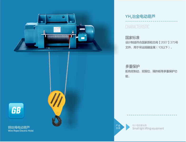 2、 冶金電動葫蘆具有雙制動、雙限位、隔熱板等多種保護功能。